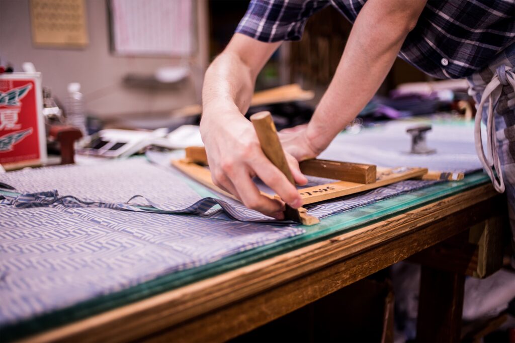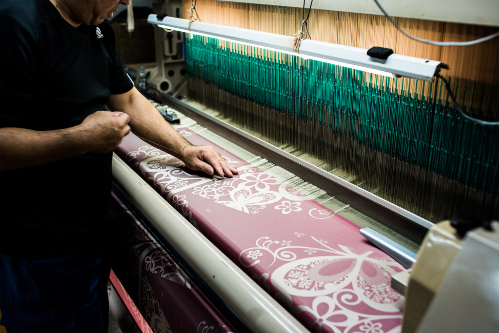 世界遺産である富士山の雪解け水を使用して鮮やかに染めた糸を使い、そこから繊細な模様や大胆な絵柄を織り上げます。タテ糸とヨコ糸で織り込んで織柄や模様を生み出し高級感のある織物を作れるジャガード織機を採用し、高密度な織物であるからこそ表現できるデザインや立体感、光沢がとても魅力的です。富士山麓で織られる織物はジャガード織機と相性がよいこと、さらに槙田商店の長い歴史の中で積み重ねてきた技術との融合によって、複雑なデザインも繊細に表現し理想のデザインを完成させています。